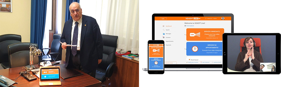 VEASYT Live! è attivabile da qualsiasi tablet, computer o smartphone a disposizione dell’AO San Pio; il personale preme un pulsante e in meno di 30 secondi l’interprete risponde in videochiamata dal proprio ufficio, pronto a tradurre simultaneamente tutto quello che viene detto tra personale dell’AO San Pio e paziente sordo.