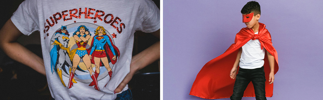 A sinistra una persona che indossa una maglietta con tre supereroine