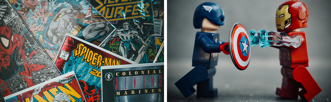 A destra i personaggi delle costruzioni di Iron Man e di Captain America che lottano tra loro