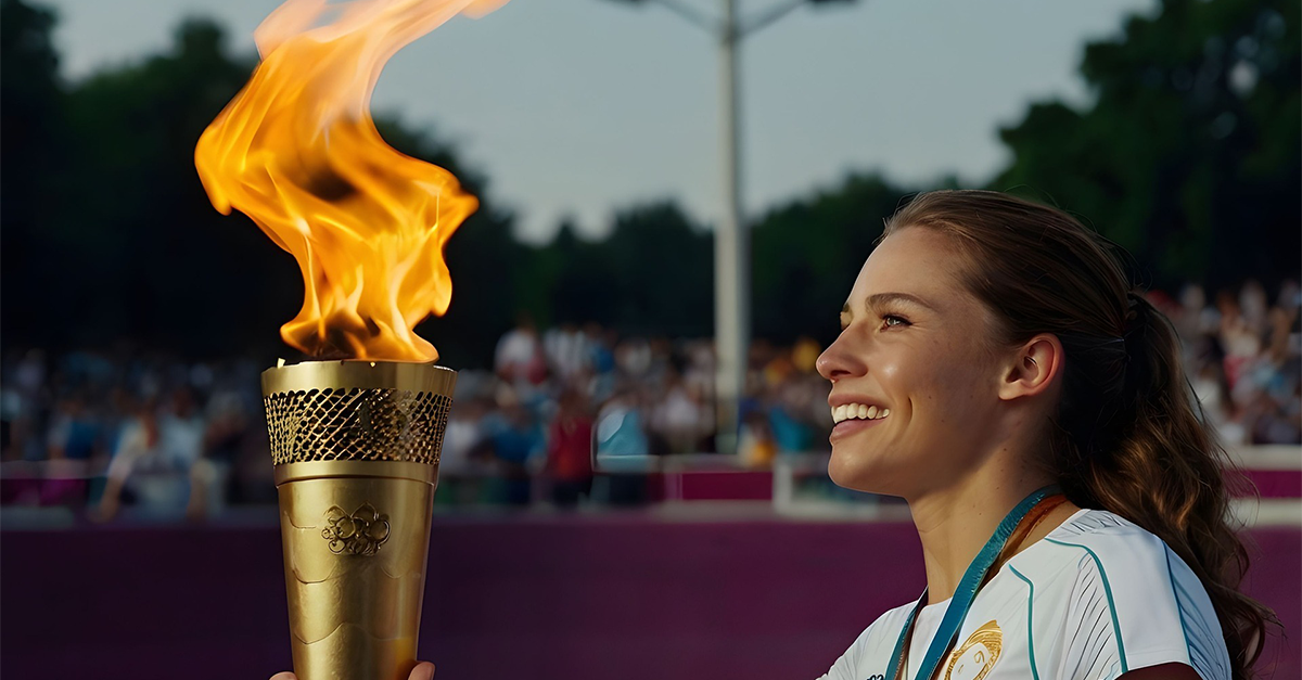 Foto rappresentativa di un'atleta che porta la fiamma olimpica (generata con IA).