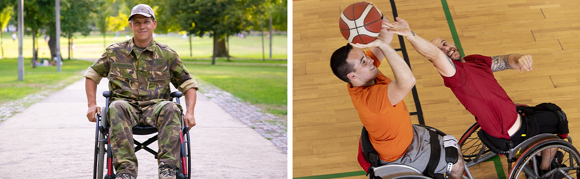 A sx un veterano in sedia a rotelle, a dx due uomini in sedia a rotelle che giocano a basket.
