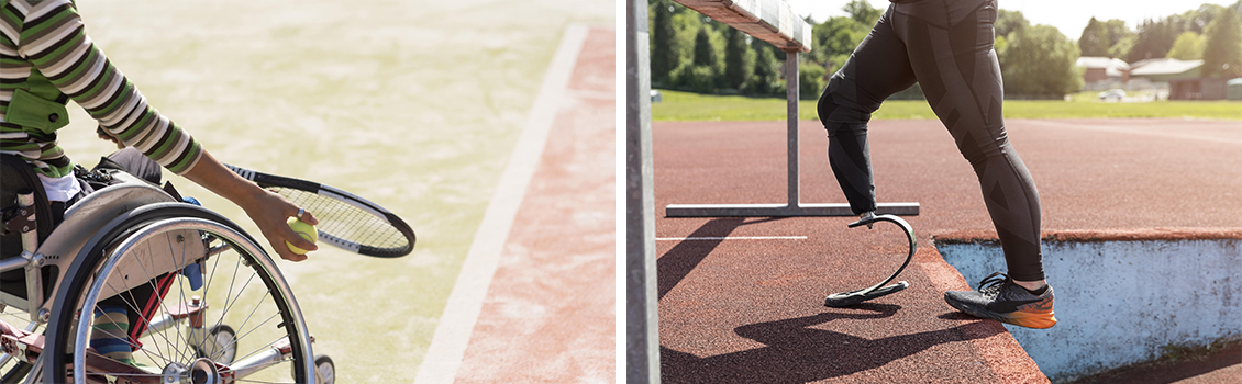 A sx un'atleta in sedia a rotelle che gioca a tennis, a dx un'atleta con una gamba artificiale che pratica atletica leggera.