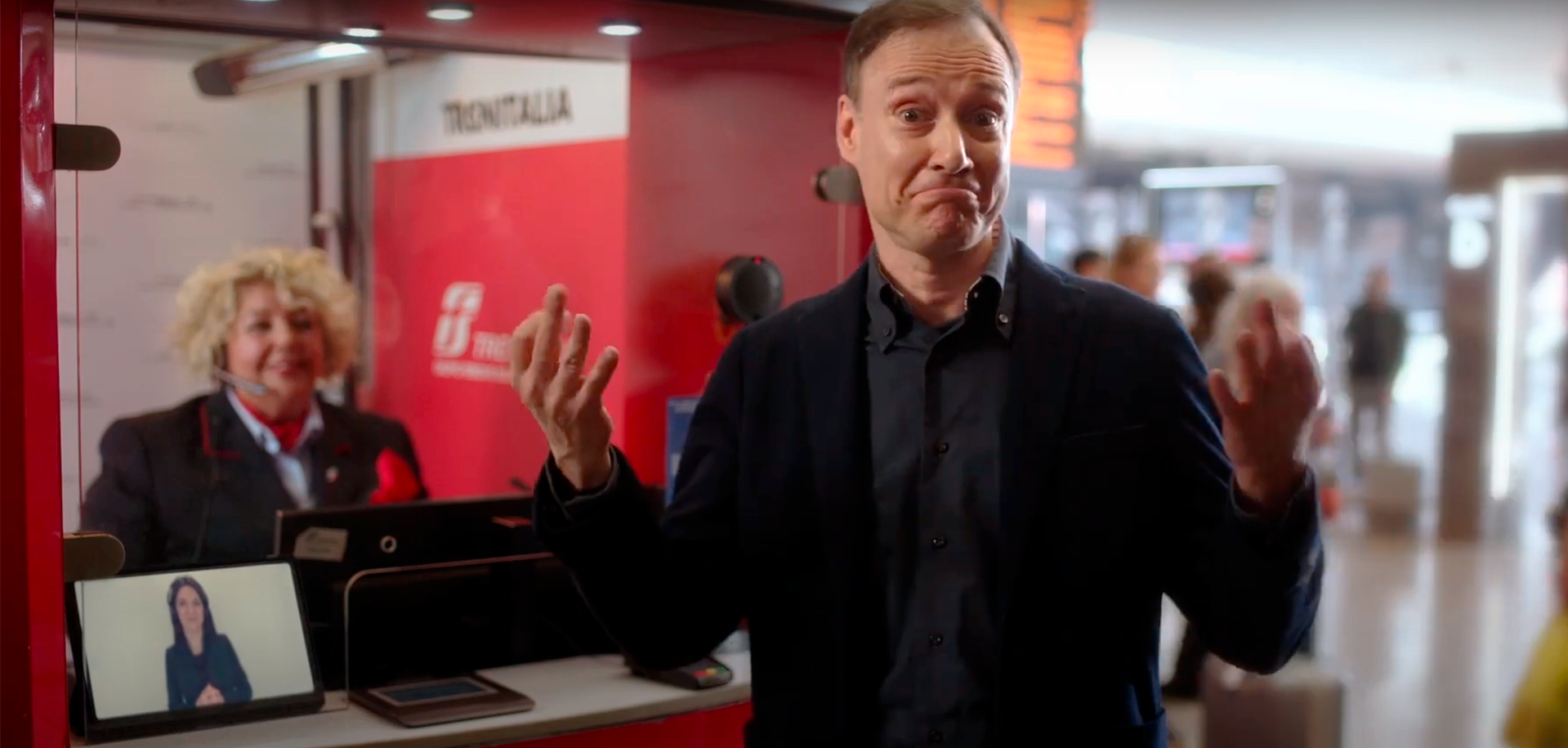 Fermo immagine tratto dal video ufficiale di Trenitalia: una persona sorda davanti ad un desk di Trenitalia con il tablet attivo in collegamento con un interprete LIS di VEASYT